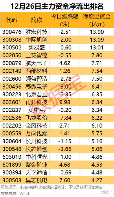 据数据宝统计,33股主力资金净流出均超3亿元,其中胜宏科技、中际旭创、新易盛、三花智控、航天电子、西部材料、领益智造等一批热门股净流出金额均超7亿元。